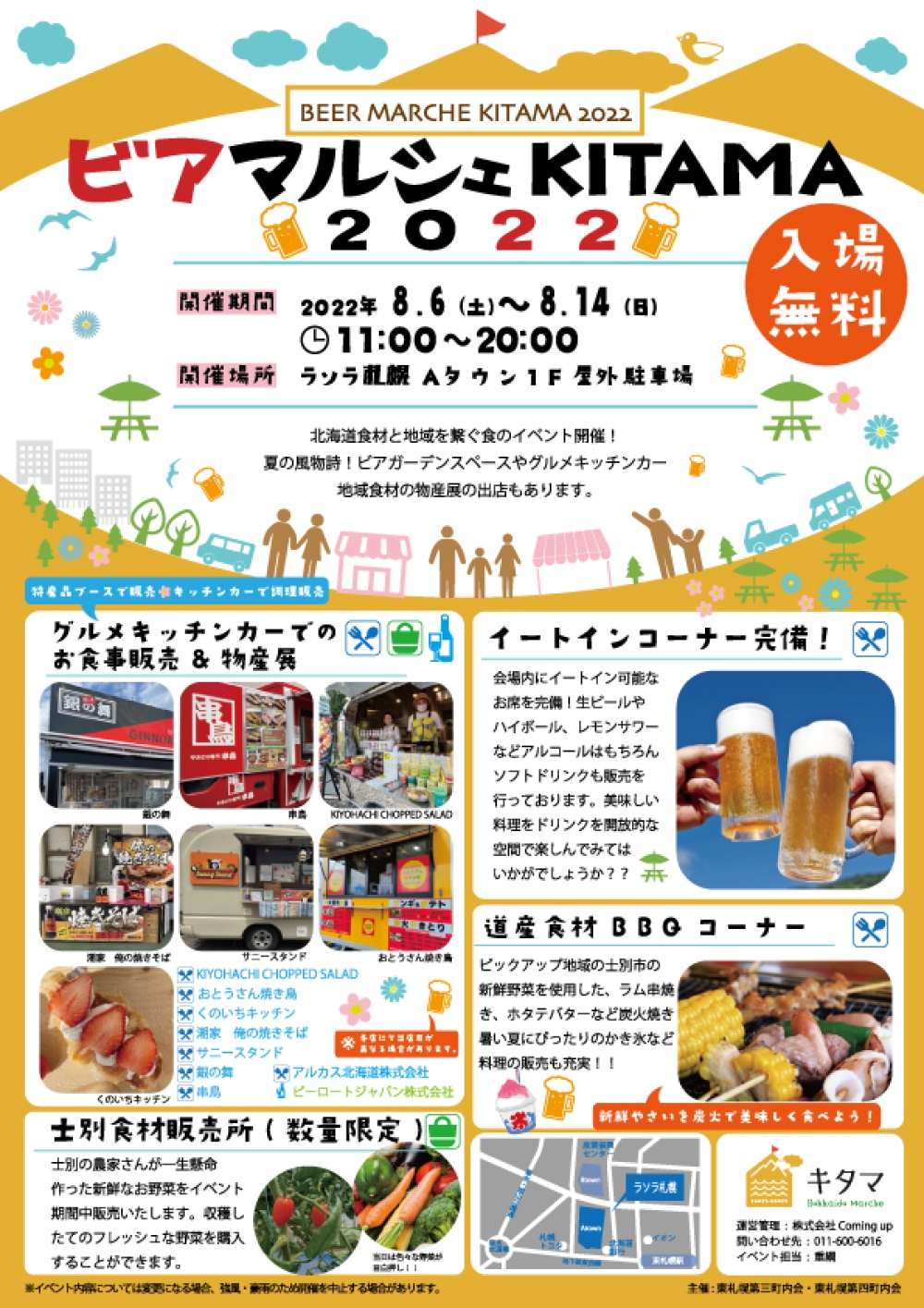 北海道食材と地域を繋ぐ食のイベント開催!夏の風物詩!ビアガーデンスペースやグルメキッチンカー、地域の食材の物産展の出店もあります。会場内にはイートイン可能なお席を完備。生ビールやハイボール、レモンサワーなどのアルコールはもちろんソフトドリンクも販売を行っています。美味しいお料理とドリンクを開放的な空間で楽しんでみてはいかがでしょうか?